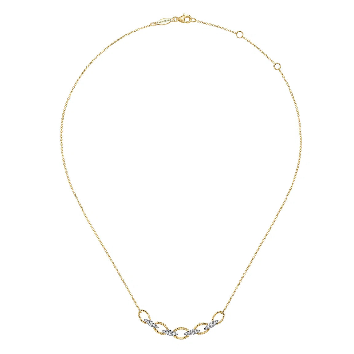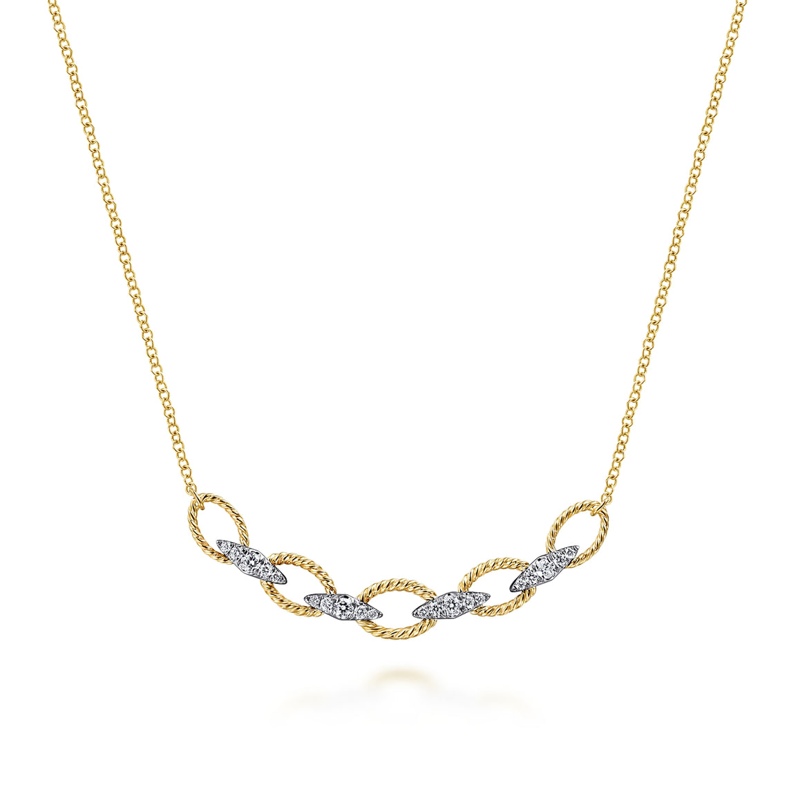 This 14K yellow and white gold chain necklace features twisted yellow gold loops linked by kite-shaped diamond-set links. With 0.25 ct of natural diamonds, it’s a timeless, heirloom-quality piece.
