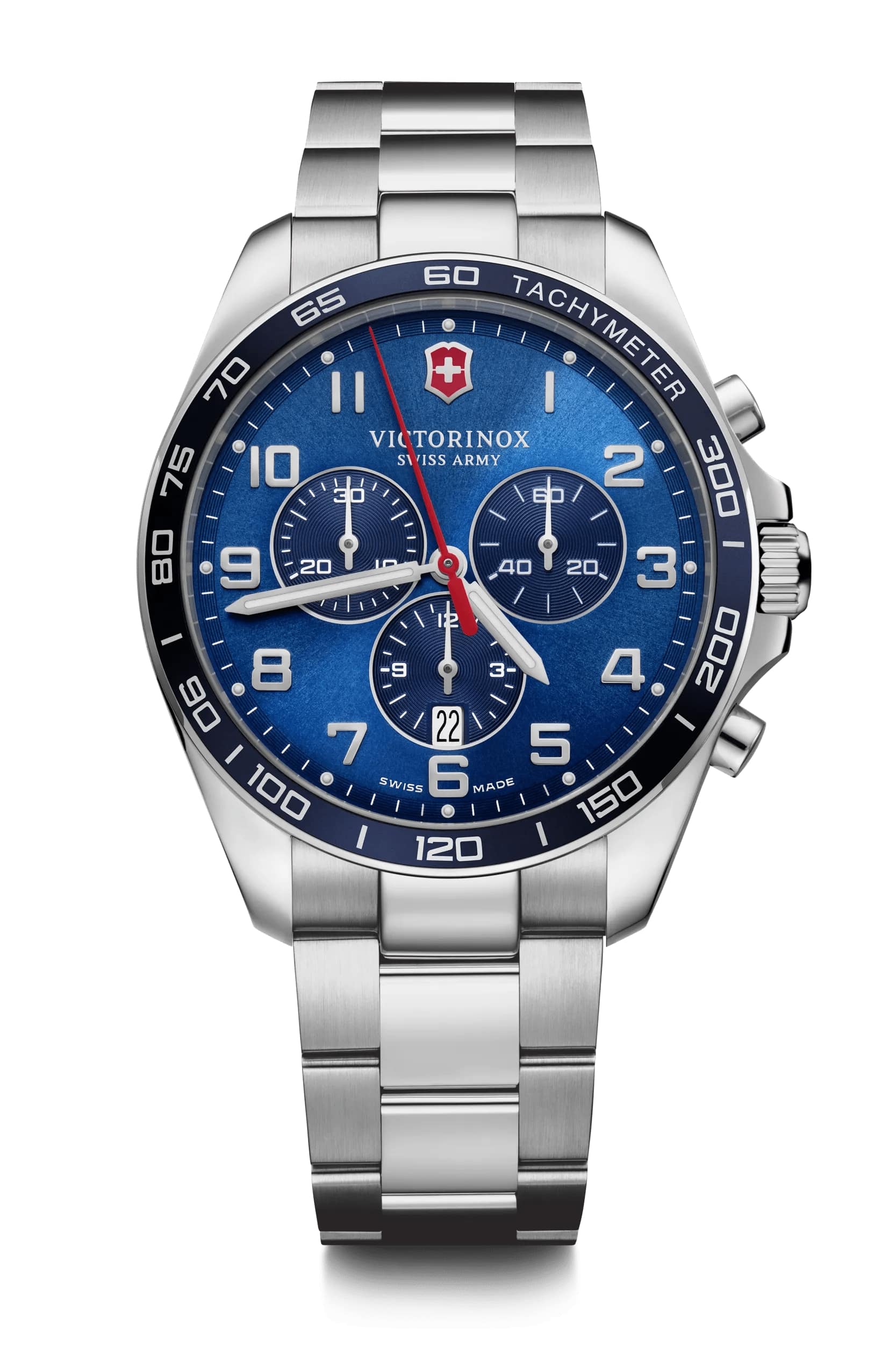 Rooted in the iconic Swiss Army Knife design, the Swiss-made FieldForce Classic Chrono combines bold aesthetics with luxe appeal. Its curved indices, vibrant dial, and Super-LumiNova® hands ensure visibility day or night. Paired with a sleek stainless steel bracelet and tested through 100 homologation checks, it delivers standout style and reliable performance for wherever life takes you.