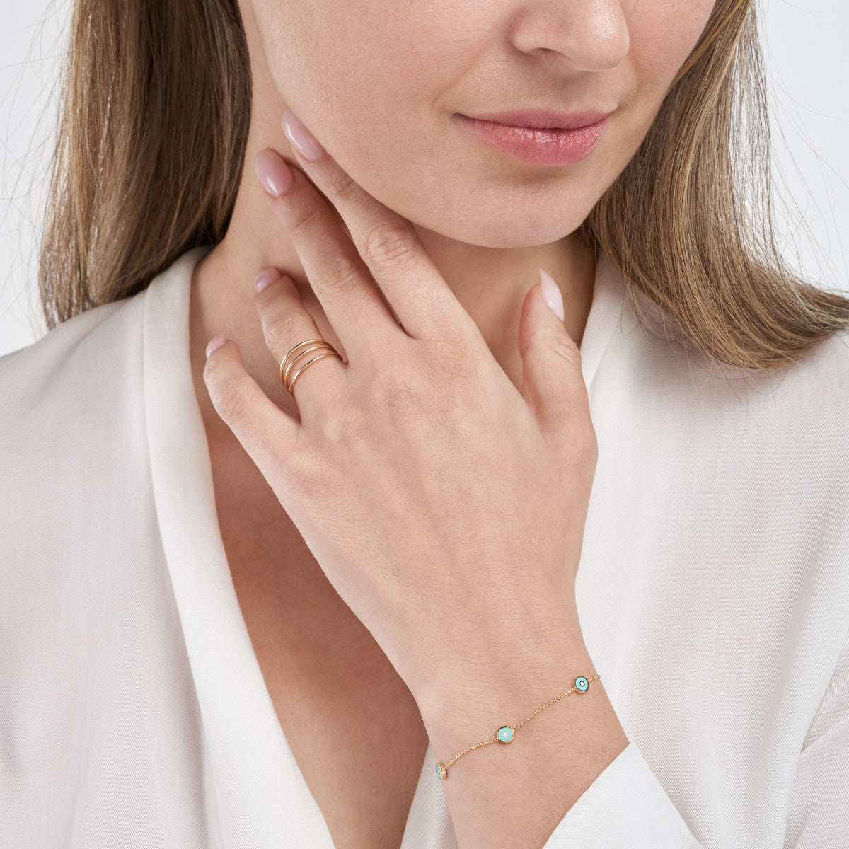 The Turquoise Enamel Evil Eye Station bracelet is a delicate 7.25-inch piece, crafted in 14K gold for everyday wear.